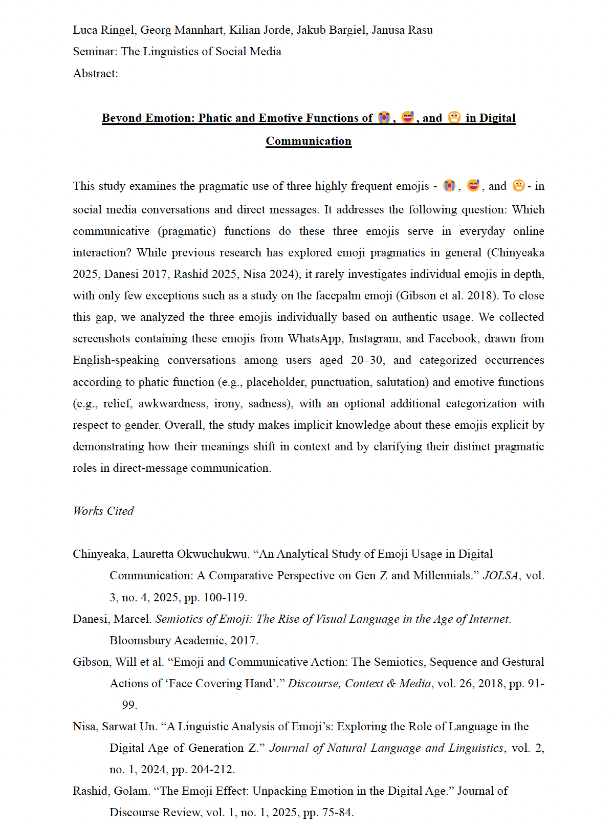 | 10.15-10.30 | Jakub Bargiel, Kilian Jorde, Georg Mannhart, Janusa Rasu & Luca Ringel (Mainz) | Beyond Emotion: Phatic and Emotive Functions of Emojis in Digital Communication |